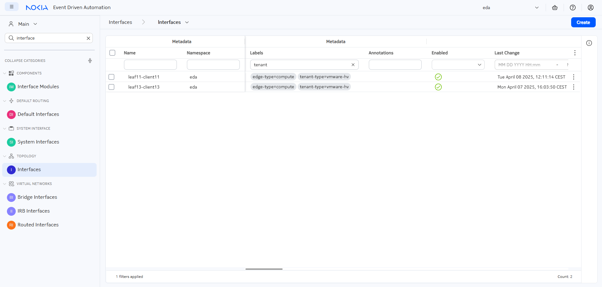 Now that both interfaces have been assigned a common label, any EDA application can select them based on the tag. If before we had to create two instances of Bridge Interface for each interface/vlab/bridge-domain triplet, now we can optimize the workflow by using a different EDA resource - the VLAN resource.