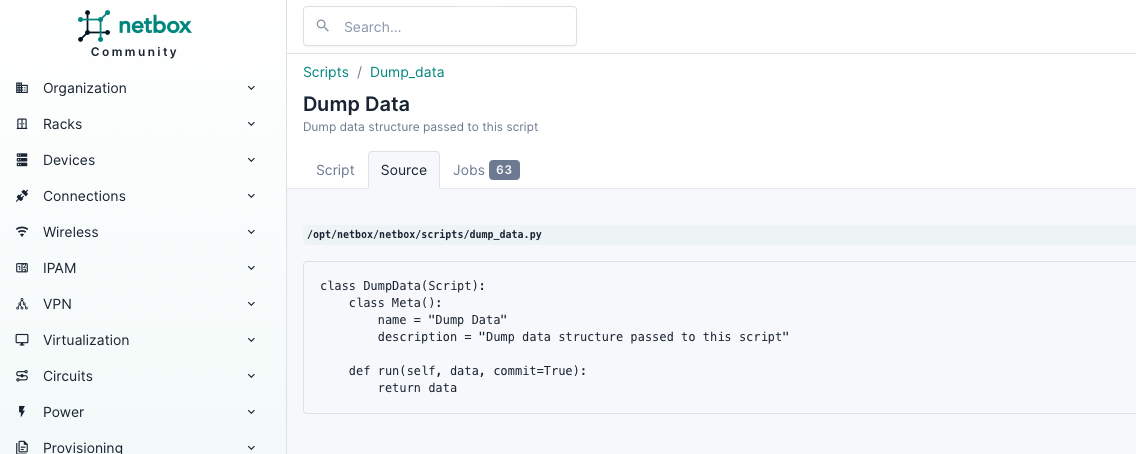 You may notice that devices don't have IPs assigned to interfaces within NetBox. Because each Hackathon instance VM has unique IP space, we must dynamically add IP addresses to each NetBox instance. The next instructions will show you an example of how a custom script is run interactively and what they can do.