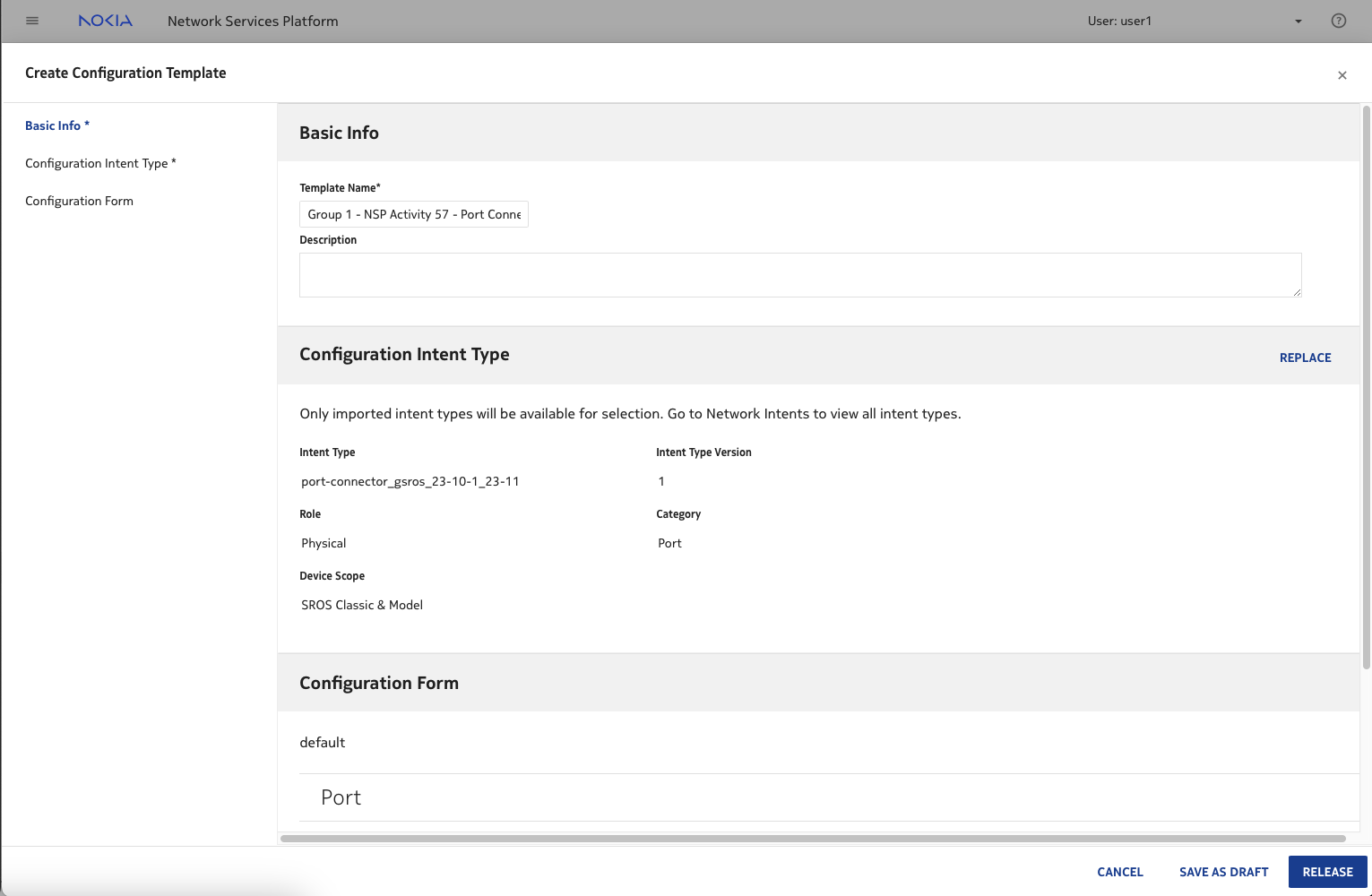 • Create a template called Group <GROUP_NUMBER> - NSP Activity 57 - Port Connector using intent-type port-connector_gsros_<version>, substitute in your group number. Click Release.