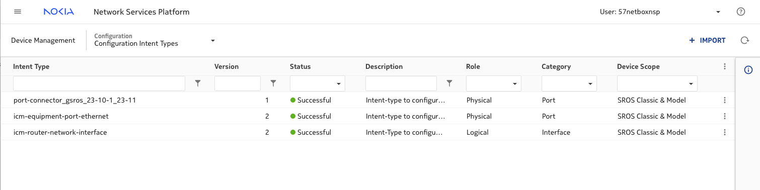 We'll now set up some configuration templates we'll later reference in our NetBox script. Head over to the NSP UI and browse to Device Management > Configuration Intent Types.