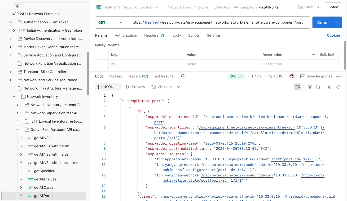 Because this is using the nsp-inventory:find RPC using RESTCONF POST, we can pass JSON in the Body tab to filter for specific ports. Inspect the Body tab and adjust the xpath filter.